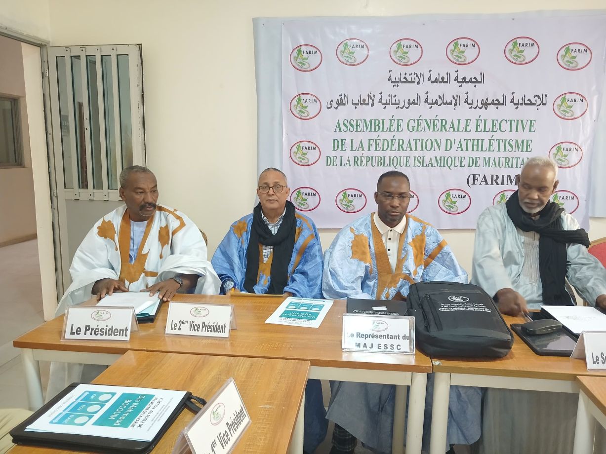 La Fédération d’Athlétisme de Mauritanie (FARIM) a tenu, samedi dernier, son assemblée générale élective dans les locaux de la Maison du basket-ball à Nouakchott. À l’issue des travaux consacrés au renouvellement du bureau exécutif, monsieur Dia Mahmoud Bocoum a été reconduit à l’unanimité à la présidence pour un nouveau mandat de quatre ans, couvrant la période 2026-2029. Élu pour la première fois le 31 Décembre 2016, le président sortant voit ainsi sa confiance renouvelée par les membres de l’instance fédérale. Le comité directeur nouvellement investi exercera ses fonctions jusqu’au 31 Décembre 2029. L’assemblée générale a également procédé à la désignation de deux présidents d’honneur : messieurs Mohamed ould Ghali et Ahmed AlyoOuld Yaghla, en reconnaissance de leur contribution au développement de l’athlétisme national.
