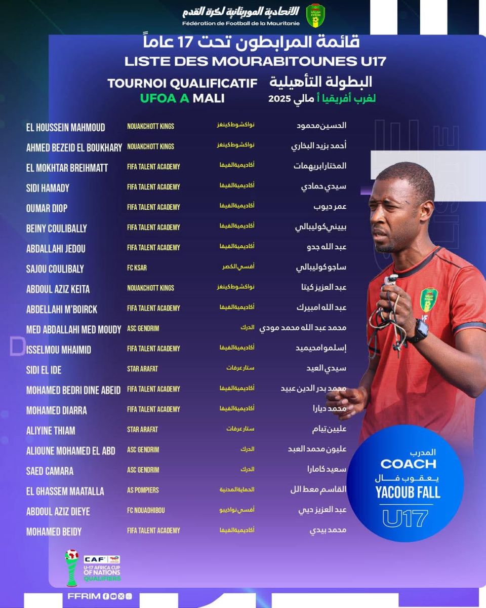 Le sélectionneur national Yacoub Fall a publié la liste des joueurs retenus avec les U17 de la Mauritanie, en vue du tournoi qualificatif de la zone « A » de l’UFOA, qui se déroulera au Mali du 3 au 18 Octobre 2025. Les Mourabitounes U17 ont été versés dans le groupe B, particulièrement relevé, aux côtés du Sénégal, champion en titre, ainsi que de la Sierra Leone et de la Guinée. Les rencontres auront lieu au stade Mamadou Konaté et au stade Ouezzin Coulibaly à Bamako, ainsi qu’au stade Diarra H de Koulikoro. Cette campagne représente une occasion majeure pour les jeunes talents mauritaniens de briller sur la scène ouest-africaine et de viser une qualification pour les phases finales.