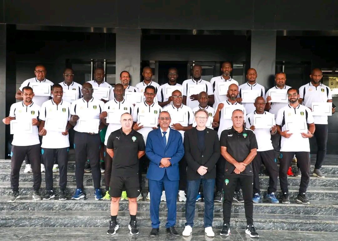 Au total, vingt-deux techniciens ont pris part à cette formation, dont trois entraîneurs étrangers : Soumaïla Coulibaly, sélectionneur des U20 du Mali, Romain Folz, coach des Young Africans (Tanzanie), et Abdoulaye Seck (Sénégal), ancien analyste vidéo des Mourabitounes sous l’ère Amir Abdou. Organisée le mercredi 24 Septembre à Nouakchott, la cérémonie de clôture a réuni plusieurs responsables, dont le secrétaire général de la FFRIM, monsieur Ahmedou Mbeirick, le directeur technique national, monsieur Luis Fuertès, ainsi que les instructeurs de la CAF, messieurs Omar Raïss El Fenni et Khalid El Mouahid, qui ont encadré les participants avec rigueur et professionnalisme. Les résultats définitifs seront validés par l’instructeur principal, monsieur Jamal Fathi, avant la délivrance officielle des diplômes par la CAF. Une étape majeure qui confirme l’ambition de la Mauritanie de renforcer son encadrement technique et de s’inscrire durablement dans les standards de formation du football continental.