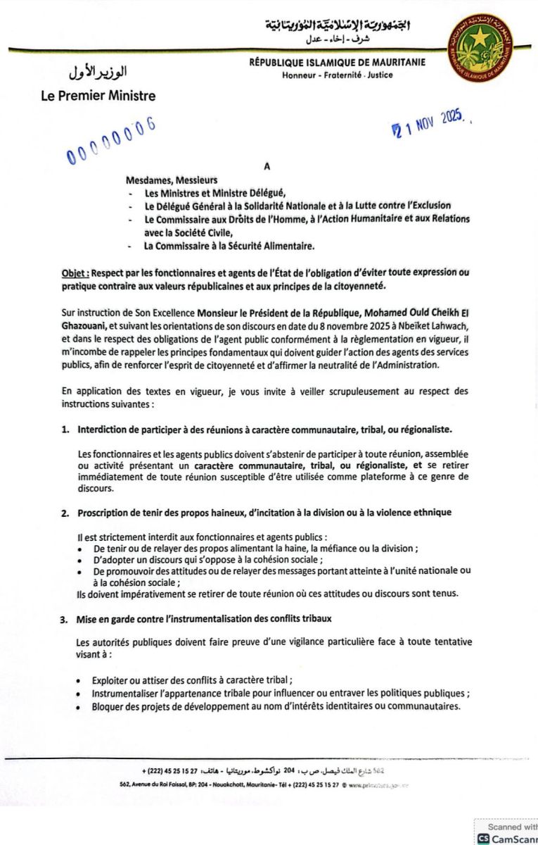 Aujourd’hui, les Mauritaniens regardent et attendent. Certes, la volonté du Raïs de traduire, dans les faits, son discours de fermeté à N’Beïket Lahwach, s’est manifestée : son Premier ministre, cité parmi les prétendants à sa succession, a adressé une circulaire aux ministres, ministres-délégués, délégué de Taazour, CSA et Commissariat aux Droits de l’Homme, pour leur demander de ne plus participer à des réunions à caractère communautaire, tribal ou régional et de s’interdire de tenir tout propos haineux, incitation à la division ou à la violence ethnique, en les mettant en garde contre l’instrumentalisation du moindre conflit tribal. Des décisions louables… mais qu’il reste à mettre en pratique.